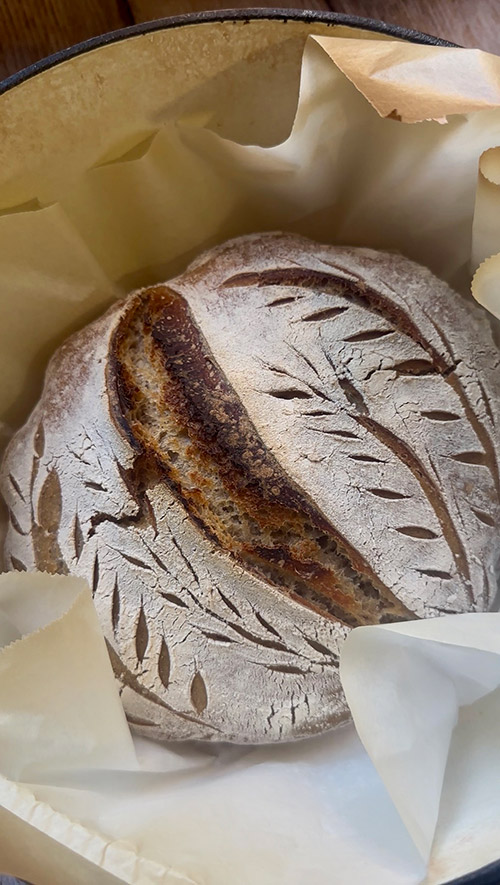 Au moment d'enfourner, sortir le banneton du frais et retourner la boule de pain sur une feuille de papier cuisson, tamiser le pain de farine puis faire des motifs ou entaille au centre et le placer dans la casserole en fonte (attention c’est très chaud). Cuire pendant 30mn, puis à 10mn de la fin de cuisson, ôter le couvercle, baisser la température du four à 220°C et poursuivre la cuisson.